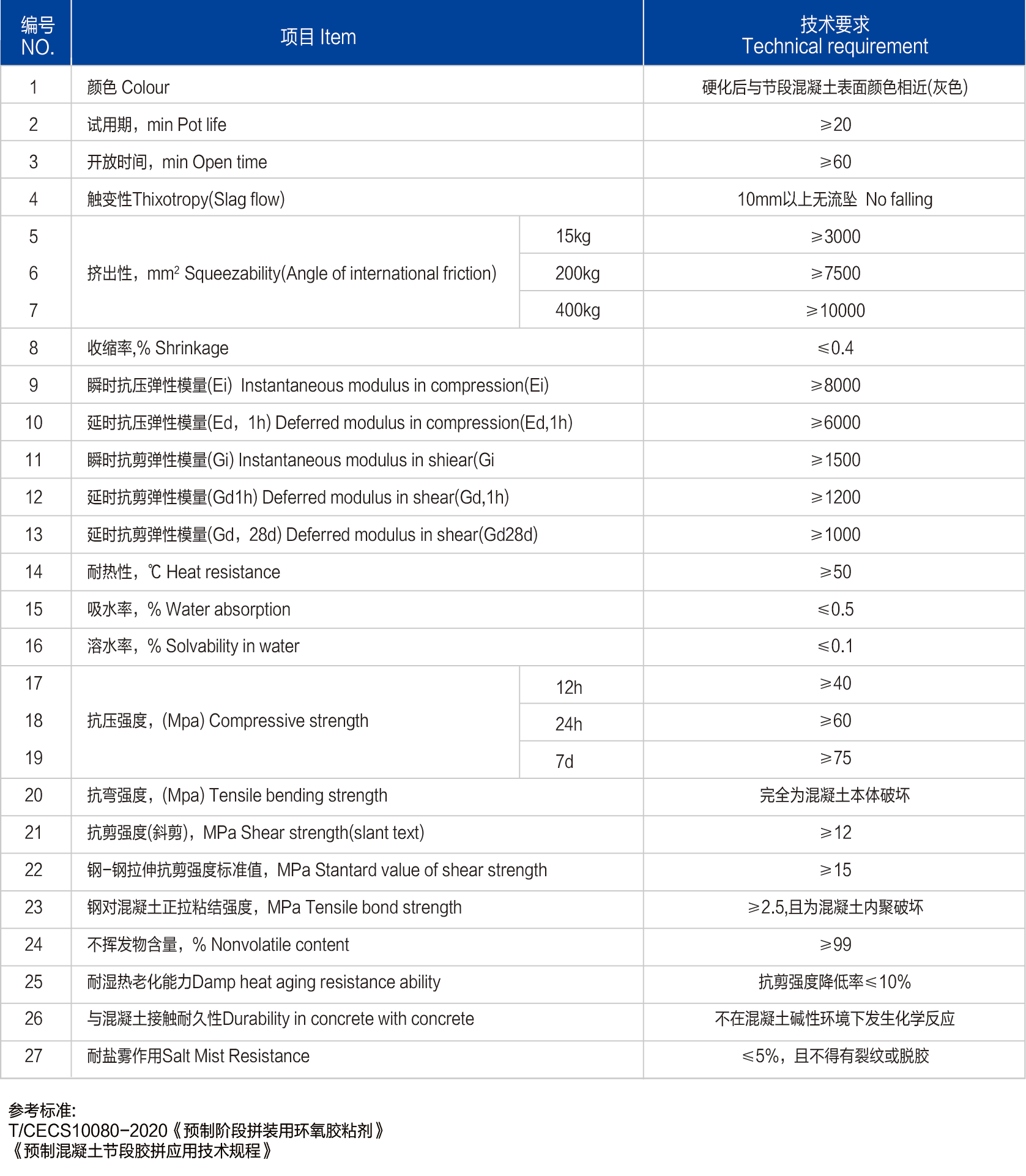 混凝土预制结构拼接胶(预制节段拼装环氧胶)主要原材料为高性能环氧树脂和改性胺、多种有机和无机材料复合而成。主要适用桥梁、涵洞、地下结构及风电塔筒的预制混凝土构件拼接施工。