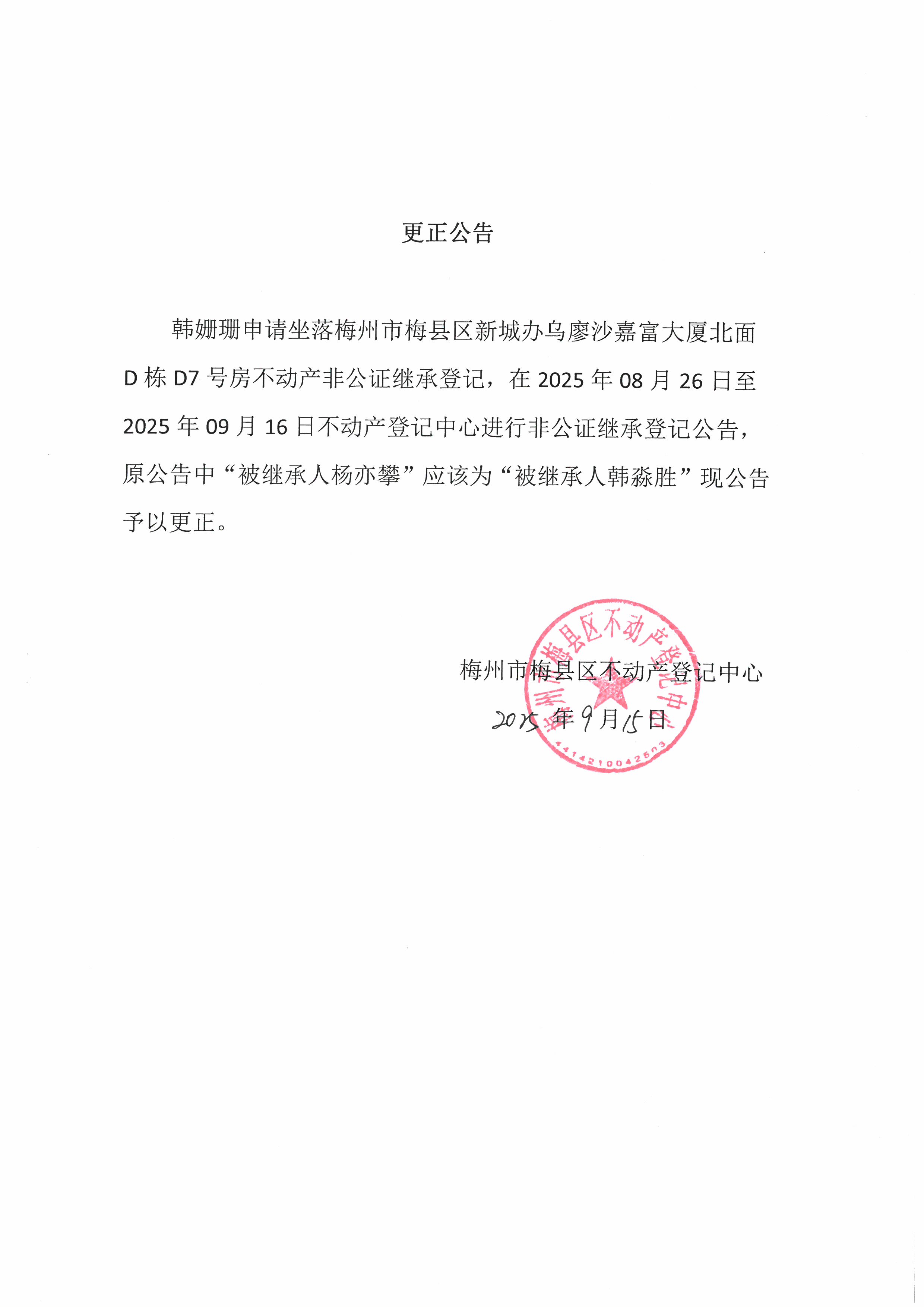 韩姗珊申请坐落梅州市梅县区新城办乌廖沙嘉富大厦北面D栋D7号房不动产非公证继承登记,在2025年08月26日至2025年09月16日不动产登记中心进行非公证继承登记公告原公告中“被继承人杨亦攀”应该为“被继承人韩淼胜”现公告予以更正。