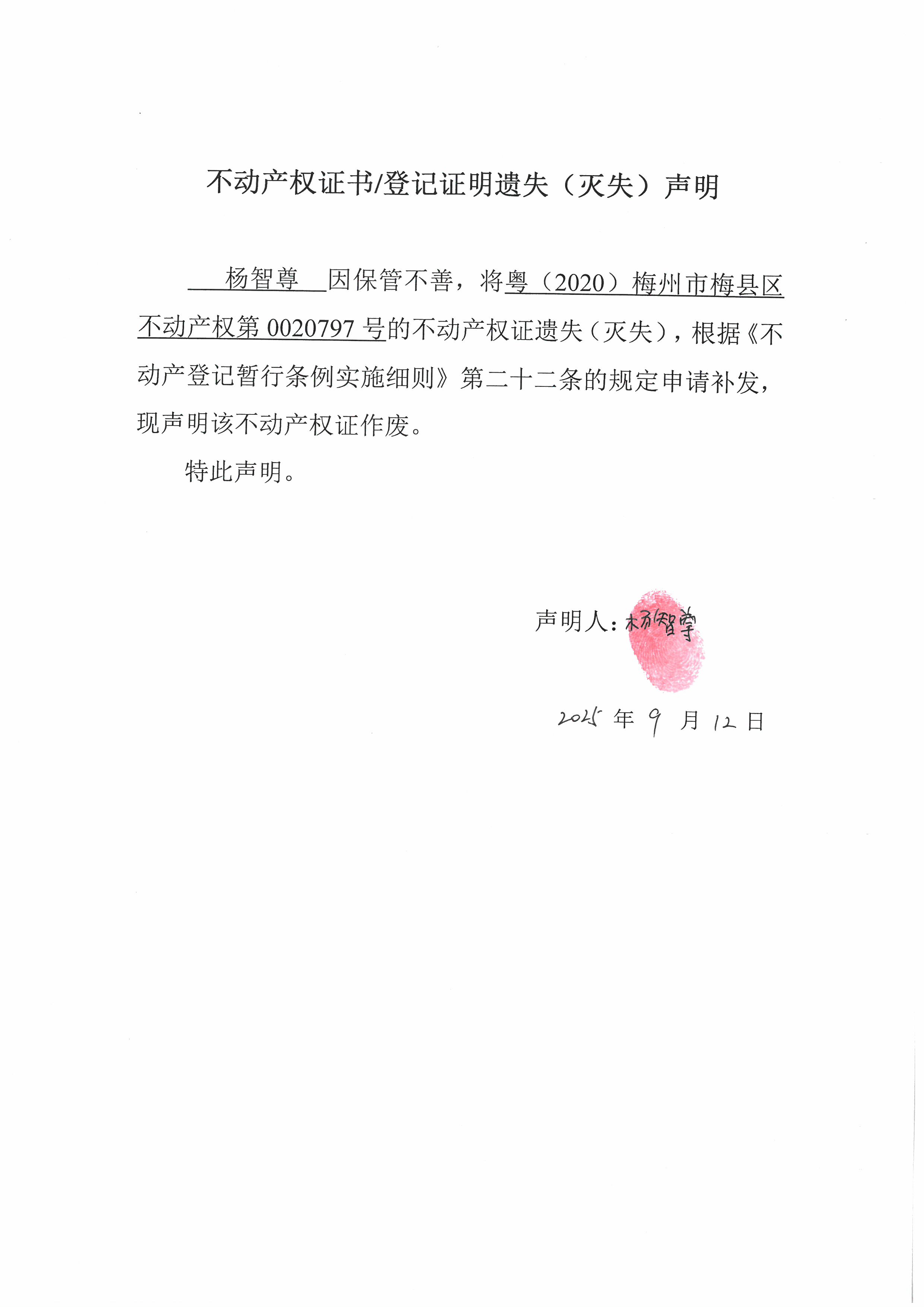 杨智尊因保管不善,将粤(2020)梅州市梅县区不动产权第0020797号的不动产权证遗失(灭失),根据《不动产登记暂行条例实施细则》第二十二条的规定申请补发,现声明该不动产权证作废。