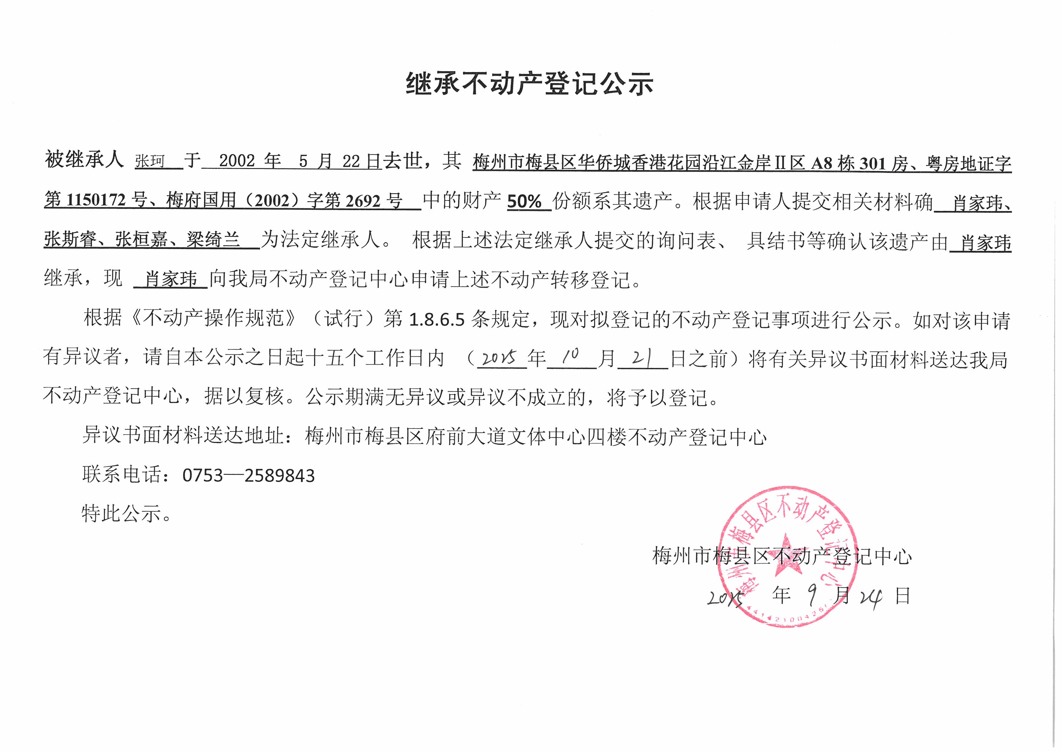 被继承人张珂于2002年5月22日去世,其梅州市梅县区华侨城香港花园沿江金岸Ⅱ区A8栋301房、粤房地证字第1150172号、梅府国用(2002)字第2692号中的财产50%份额系其遗产。根据申请人提交相关材料确肖家玮、张斯睿、张桓嘉、梁绮兰为法定继承人。根据上述法定继承人提交的询问表、具结书等确认该遗产由肖家玮继承,现肖家玮向我局不动产登记中心申请上述不动产转移登记。