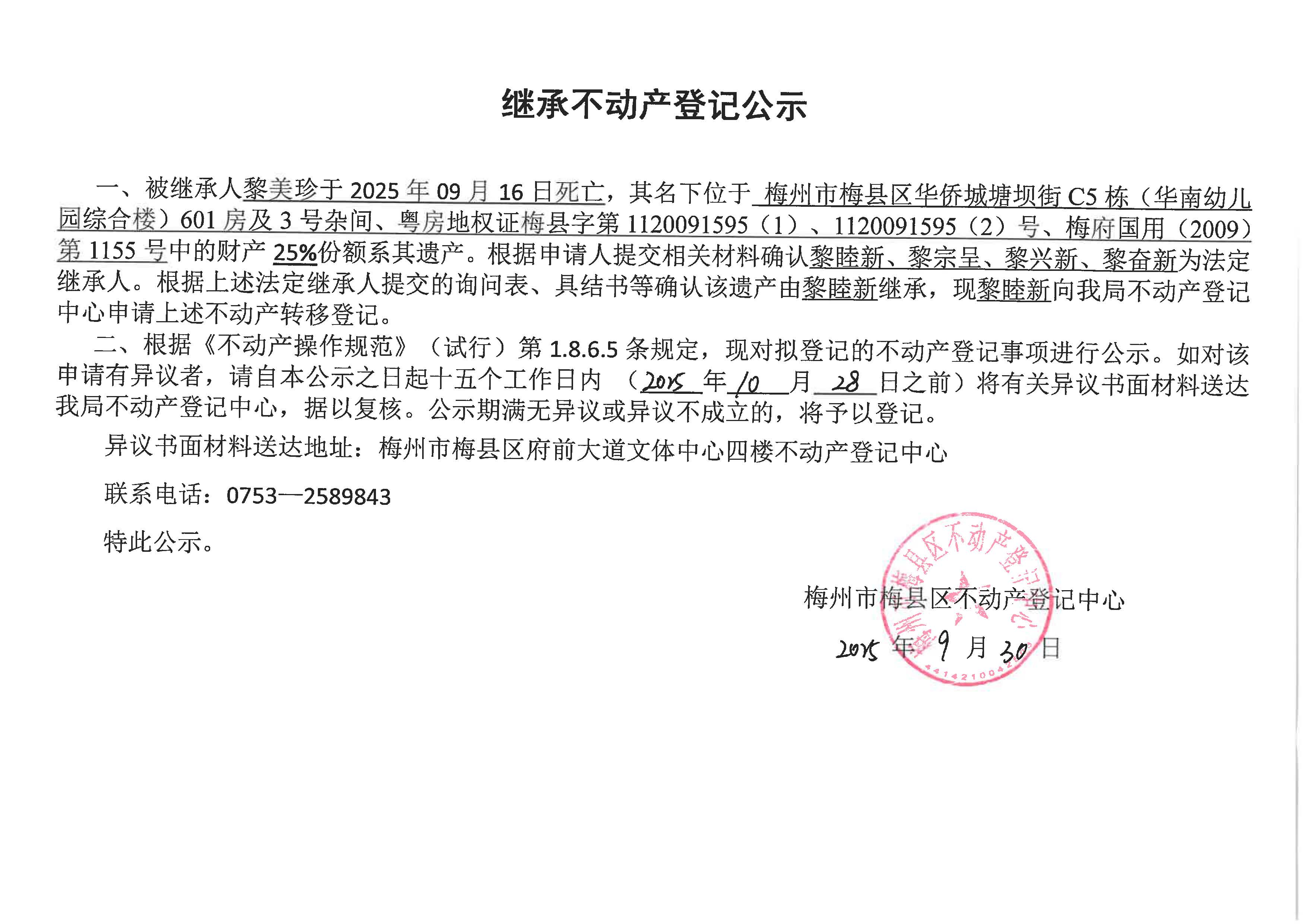 被继承人黎美珍于2025年09月16日死亡,其名下位于梅州市梅县区华侨城塘坝街C5栋(华南幼儿园综合楼)601房及3号杂间、粤房地权证梅县字第1120091595(1)、1120091595(2)号、梅府国用(2009)第1155号中的财产25%份额系其遗产。根据申请人提交相关材料确认黎睦新、黎宗呈、黎兴新、黎奋新为法定继承人。根据上述法定继承人提交的询问表、具结书等确认该遗产由黎睦新继承,现黎睦新向我局不动产登记中心申请上述不动产转移登记。