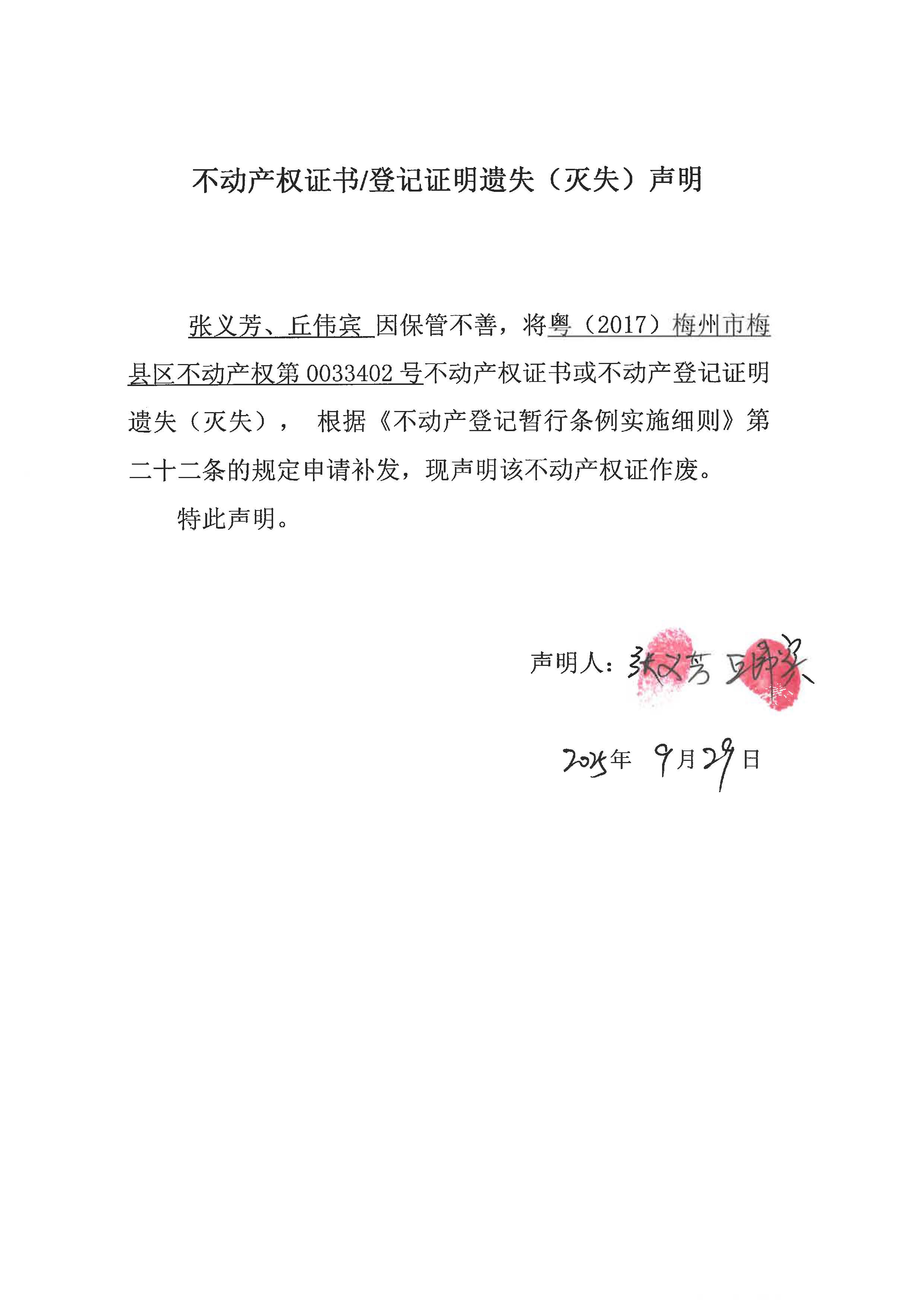 张义芳、丘伟宾因保管不善,将粤(2017)梅州市梅县区不动产权第0033402号不动产权证书或不动产登记证明遗失(灭失),根据《不动产登记暂行条例实施细则》第二十二条的规定申请补发,现声明该不动产权证作废。