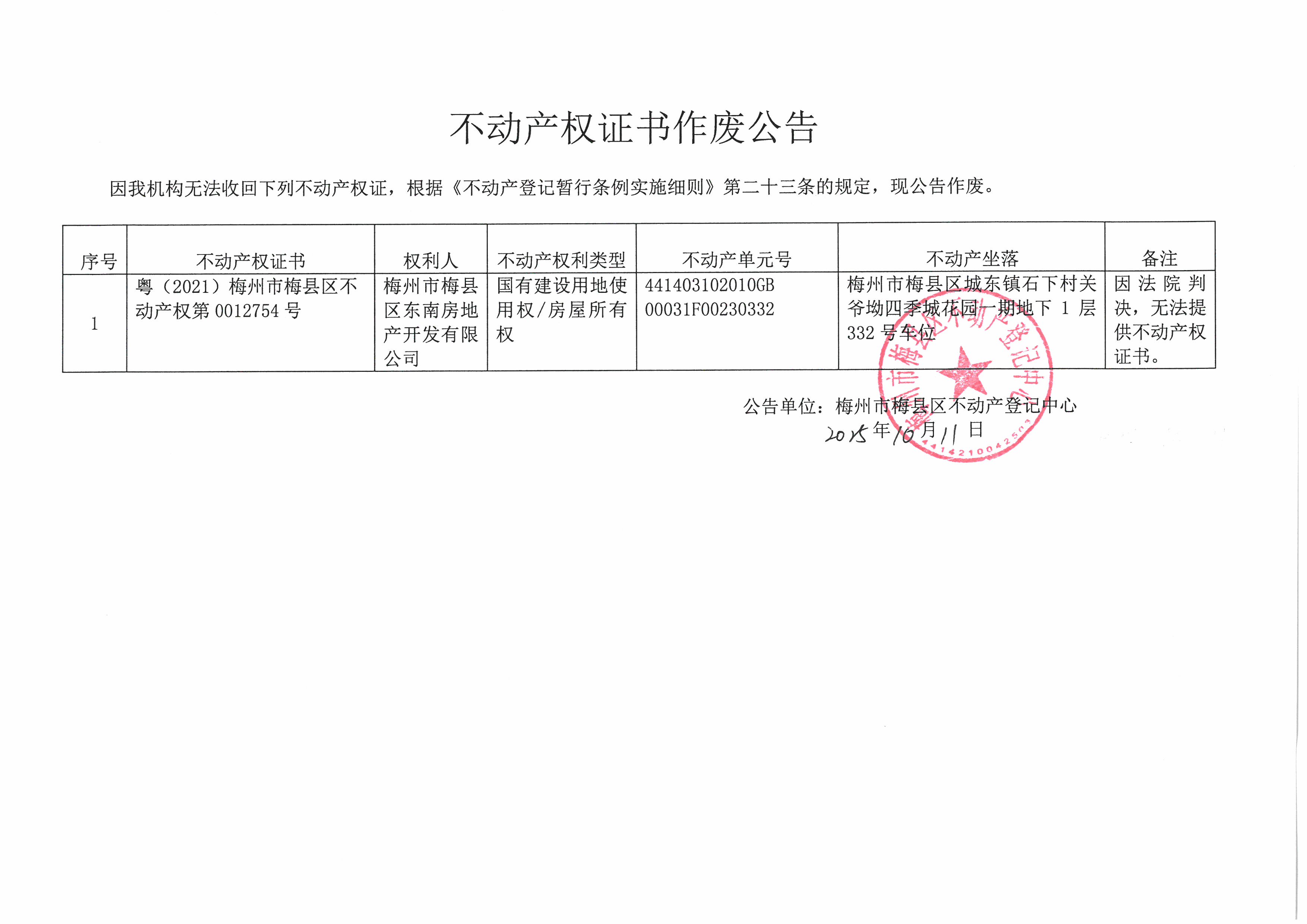 不动产登记中心登记公告(作废公告-梅州市梅县区东南房地产开发有限公司-粤(2021)梅州市梅县区不动产权第0012754号)
