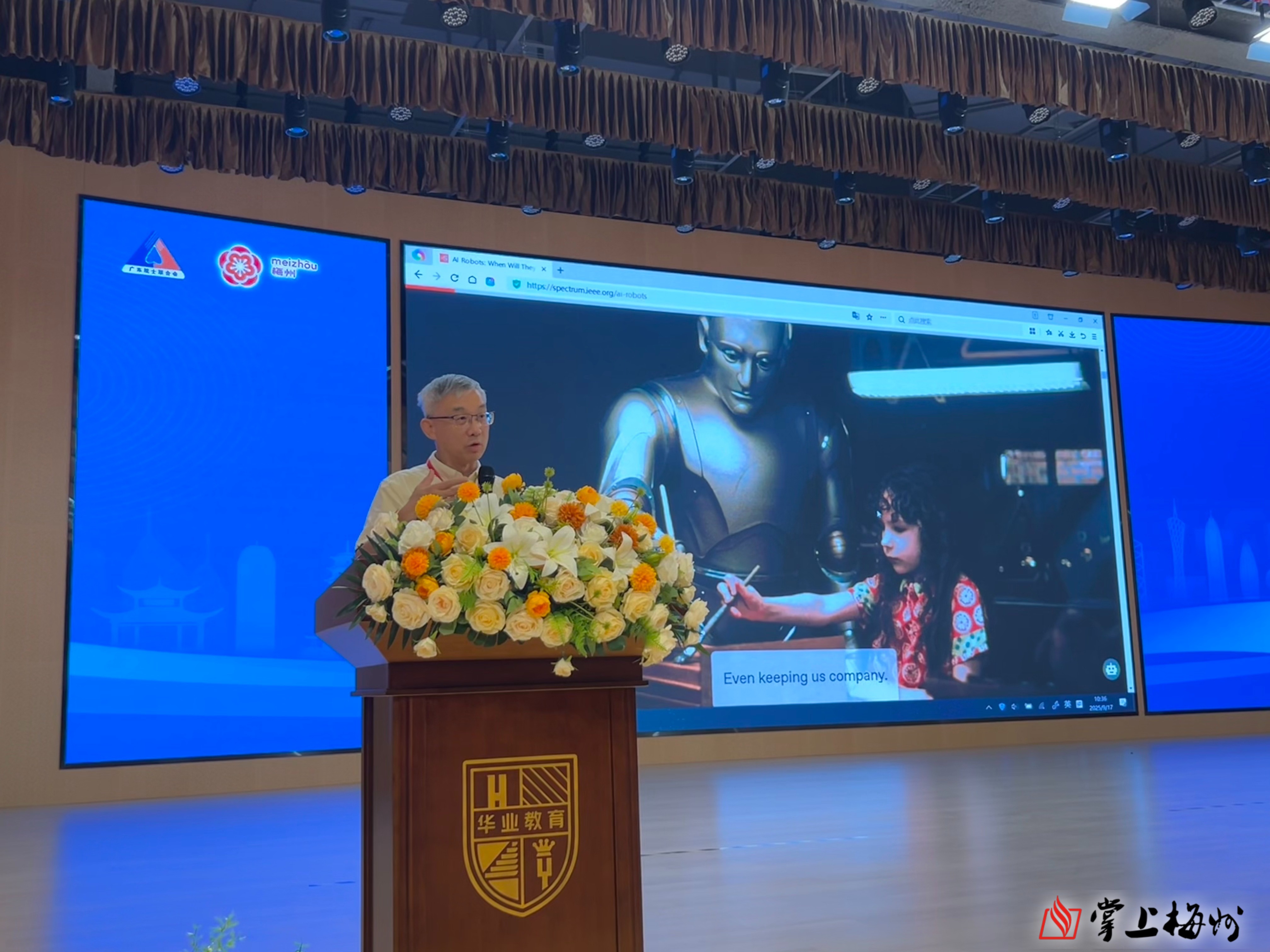 王煜首先参观了梅州市梅县区华业外国语高级中学,了解学校情况,随后在学校报告厅以《人形机器人时代真的到来了吗?》为题,为该校师生带来了一场精彩纷呈的科普讲座。讲座中,王煜教授以机器人在家庭生活以及社会各领域场景的实际应用为切入点,借助图片、视频等资料,用通俗易懂的语言深入浅出地阐述了人形机器人发展现状与未来前景。