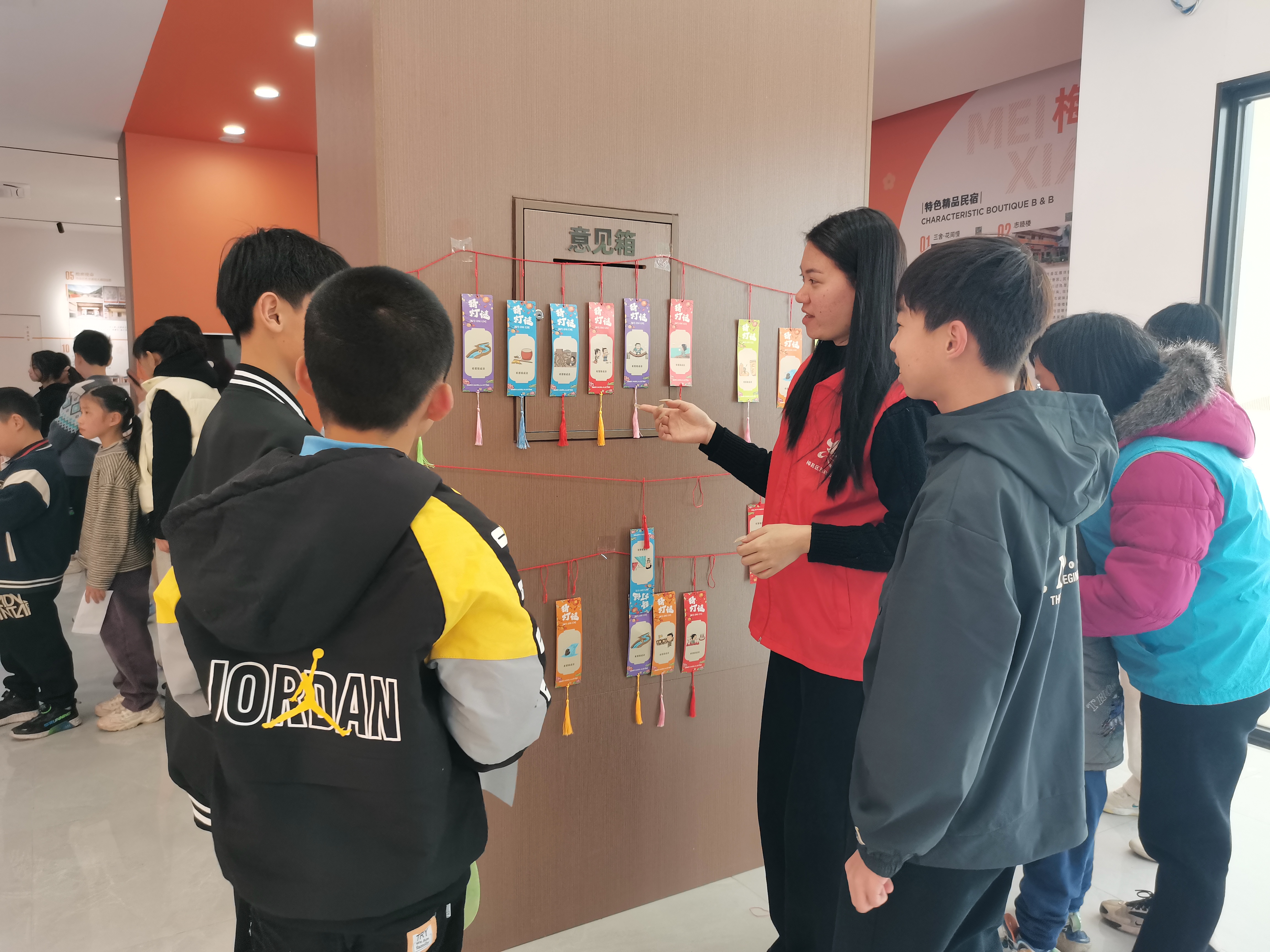 志愿者向大家讲解元宵节的历史渊源和传统活动,并对游园活动的相关规则和注意事项进行介绍。
