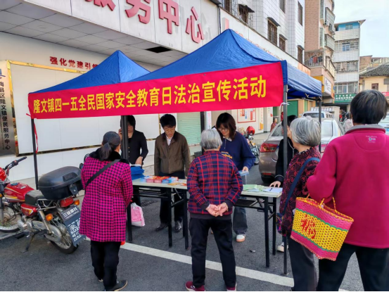 为深入贯彻总体国家安全观,增强全民国家安全意识,4月14日,隆文镇统筹镇平安法治办、派出所、司法所、行政综合执法大队、驻村律师等,在隆文圩镇开展“4·15全民国家安全教育日”法治宣传活动,通过“宣传普法+案例宣讲”形式,将国家安全知识送到群众身边。