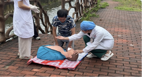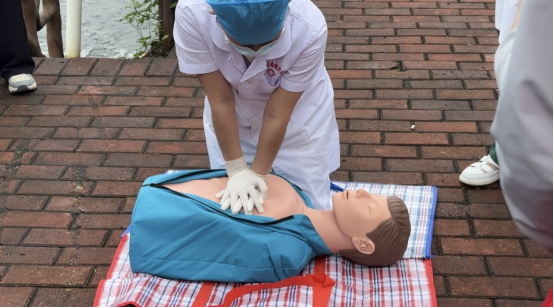活动现场,卫生院医护人员首先清晰讲解了落水遇险后的关键报医流程,强调及时、准确报医的重要性。随后,教学重点转向核心的急救技能——心肺复苏(CPR),细致地分解操作的每一个关键环节——胸外按压的部位、需要达到的正确深度等等。特别强调进行人工呼吸时,必须捏住被救者鼻子以确保有效“渡气”。除此之外,以及至关重要的是按压与人工呼吸的配合频率(30次胸外按压配合2次人工呼吸)。每一个要点都关乎生命的复苏,大家听得格外专注。