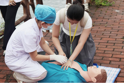 在卫生院医护人员耐心细致的讲解和规范示范后,“大‘柚’可为”实践团的同学们不仅迅速行动起来,分组协助指导管水员们进行实操练习,他们自身也积极投入,作为学员亲身参与了沉浸式的急救实操体验。在医护人员的指导下,实践团成员们认真练习感受并掌握达到有效深度的按压力度。